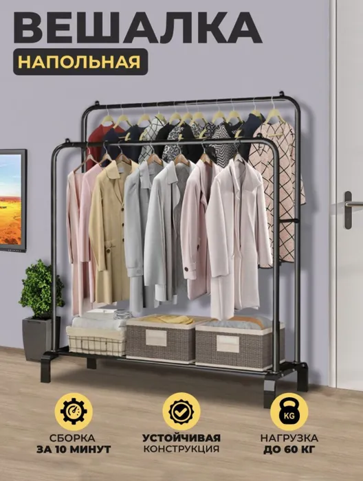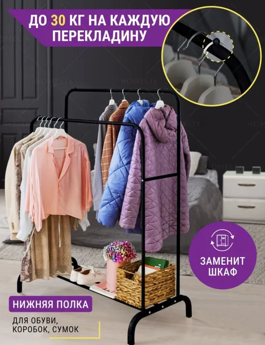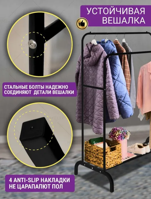 Это надежная устойчивая вместительная мебель с противоскользящими ножками (не нужны стопор или клин), которая не царапает пол/покрытие и является современным решением для хранения одежды, помощь для тех кто любит свободное пространство и ухоженный вид одежды.